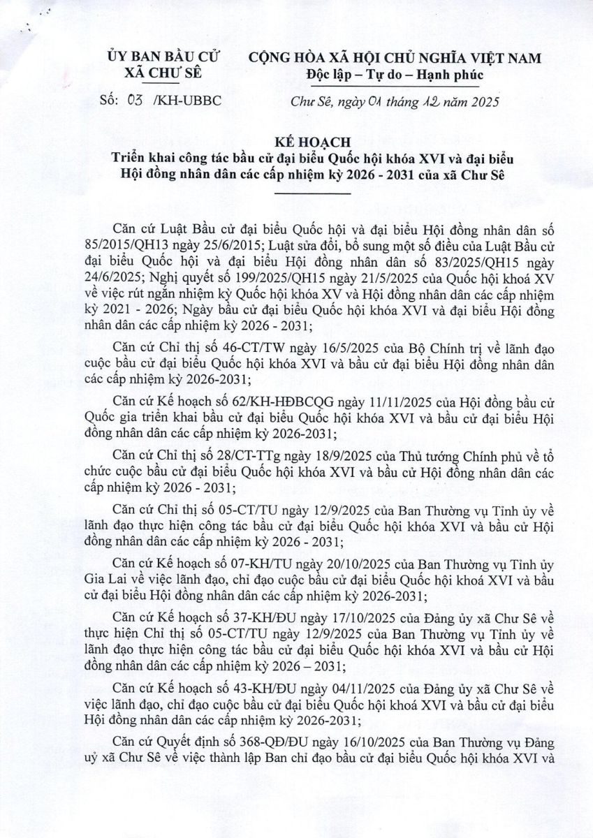 Thứ tư, 10/12/2025 | 10:49 A- A A+ | Kế hoạch triển khai công tác bầu cử Đại biểu Quốc hội khóa XVI và đại biểu HĐND các cấp nhiệm kỳ 2026 - 2031 của xã Chư Sê Chia sẻ Đọc bài Lưu Tập tin đính kèm Trình duyệt không hỗ trợ iframe.