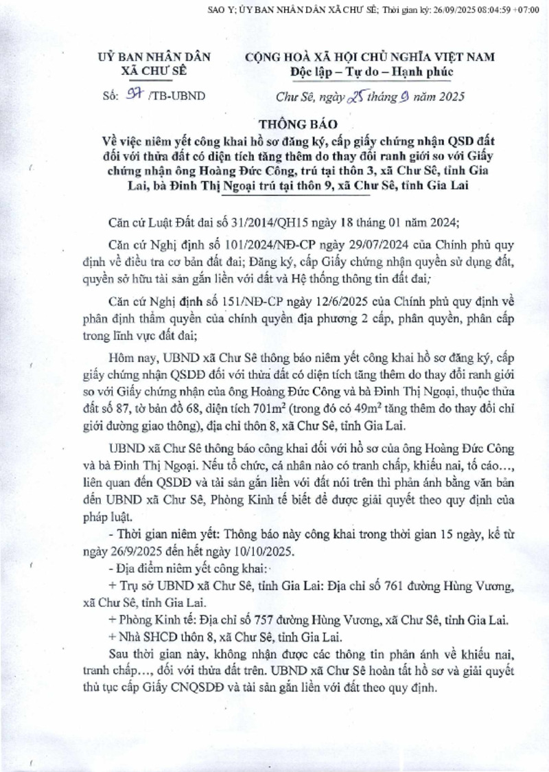 Thông báo niêm yết công khai kết quả kiểm tra hồ sơ đăng ký đất đai, cấp GCN QSD đất và tài sản gắn liền với đất lần đầu của ông Hoàng Đức Công và bà Đinh Thị Ngoại