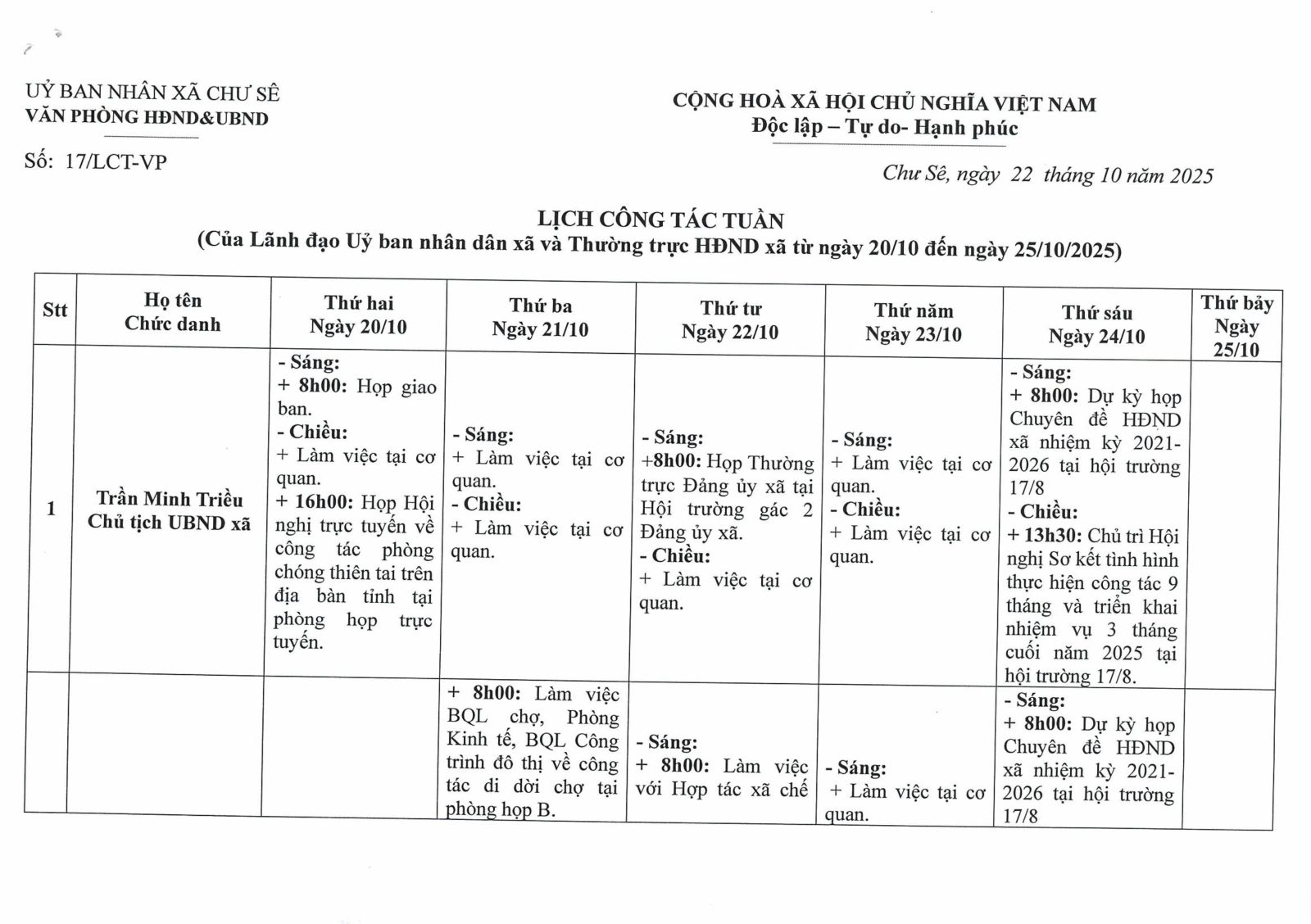 Lịch công tác tuần 20/10/2025 - 25/10/2025