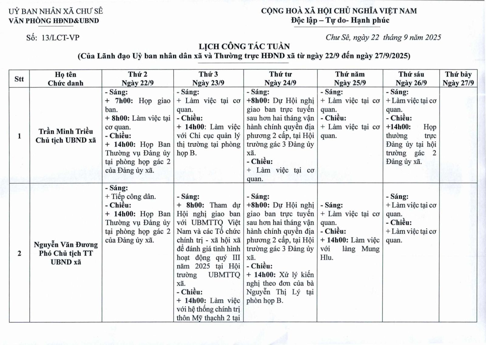Thứ hai, 22/09/2025 | 16:20 A- A A+ | Lịch công tác Tuần( từ ngày 22/9/đến 27/9/2025) Chia sẻ Đọc bài Lưu