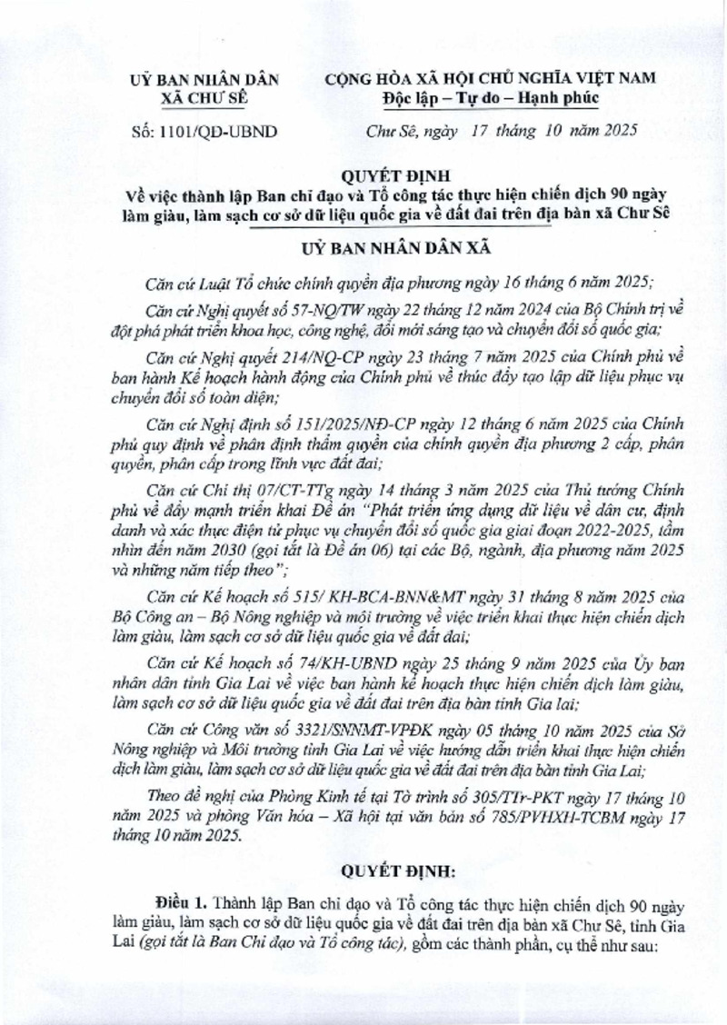| Tiêu đề văn bản | QĐ Thành lâp BCĐ và tổ công tác thực hiện Chiến dịch 90 ngày làm giàu, làm sạch cơ sở dữ liệu quốc gia về đất trên địa bàn xã Chư Sê | ||