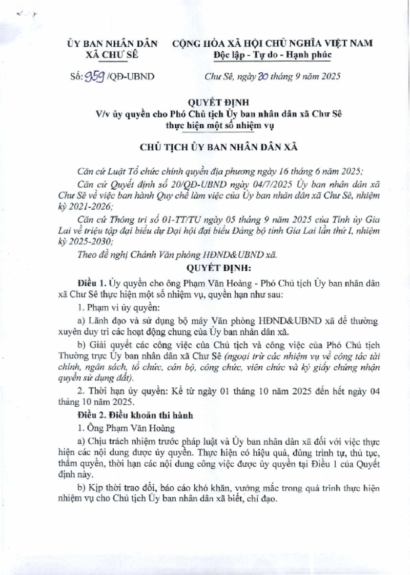 Tiêu đề văn bản | QĐ uỷ quyền cho PCT UBND xã Chư Sê một số nhiệm vụ | ||