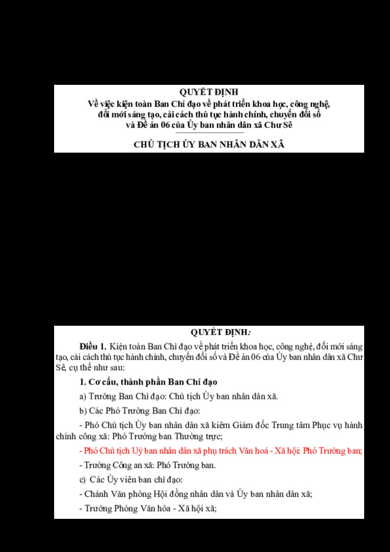 | Tiêu đề văn bản | Về việc kiện toàn Ban Chỉ đạo về phát triển khoa học, công nghệ, đổi mới sáng tạo, cải cách thủ tục hành chính, chuyển đổi số và Đề án 06 của Ủy ban nhân dân xã Chư Sê | ||