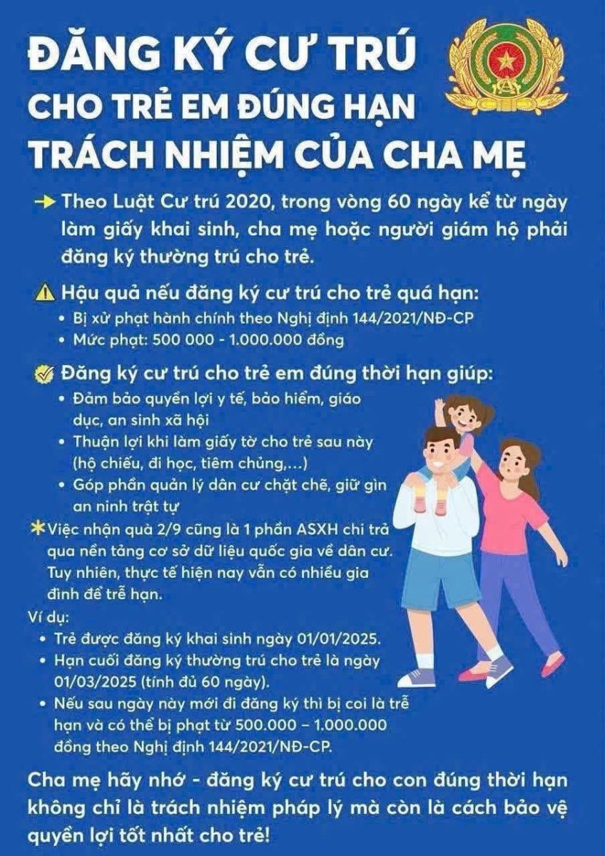 Việc đăng ký thường trú cho trẻ đúng thời hạn giúp cập nhật đầy đủ thông tin vào Cơ sở dữ liệu quốc gia về dân cư, bảo đảm quyền lợi cho trẻ em trong các chính sách an sinh xã hội, y tế, giáo dục và là cơ sở để trẻ được cấp thẻ bảo hiểm y tế dưới 6 tuổi. Đây cũng là trách nhiệm của cha mẹ trong việc quản lý cư trú, góp phần xây dựng hệ thống dữ liệu dân cư “đúng – đủ – sạch – sống”, phục vụ hiệu quả công tác quản lý nhà nước.