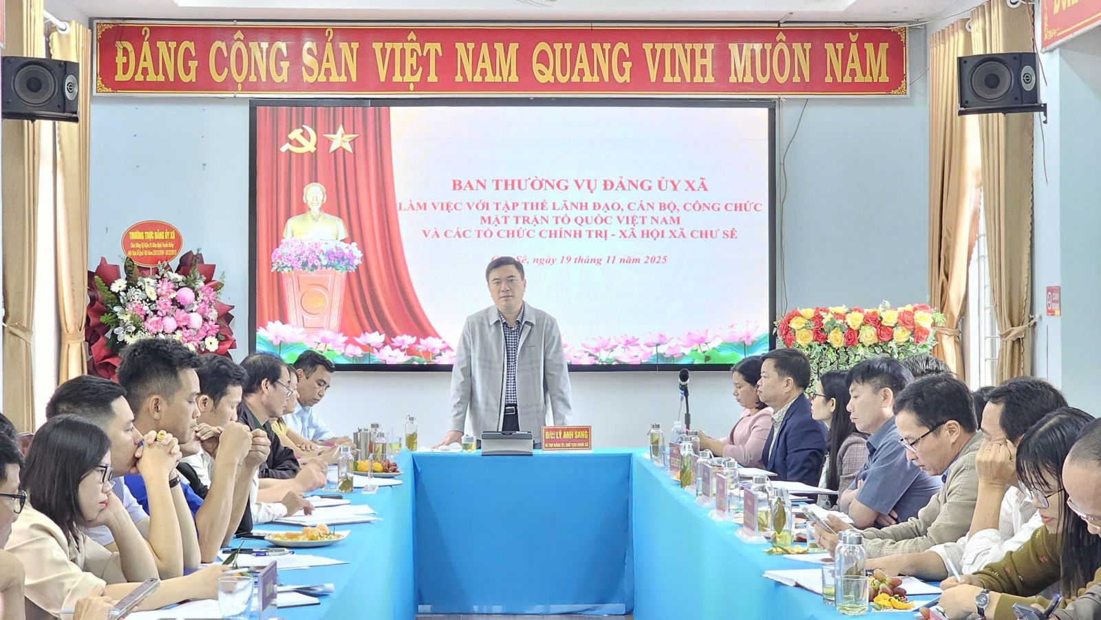 Sáng ngày 19/11/2025, tại hội trường UBMTTQ VN xã; BTV Đảng ủy xã Chư Sê đã có buổi làm việc với tập thể lãnh đạo, cán bộ, công chức MTTQ Việt Nam và các tổ chức chính trị - xã hội xã Chư Sê. Đồng chí Lý Anh Sang – Bí thư Đảng ủy, Chủ tịch HĐND xã chủ trì buổi làm việc. Dự buổi làm việc có các đồng chí Rah Lan H’Thanh – Phó bí thư Thường trực Đảng ủy xã; Trần Minh Triều - Phó bí thư, Chủ tịch UBND xã; Kpui H’ Blê – Phó chủ tịch HĐND xã; Nguyễn Văn Đương – Phó chủ tịch UBND xã; Phạm Văn Hoàng – Phó chủ tịch UBND xã.