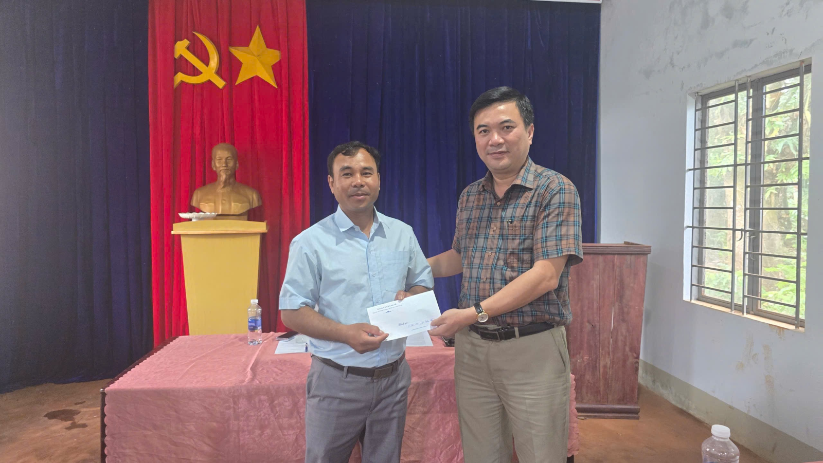 Đồng chí Bí thư Đảng ủy Lý Anh Sang đã trao tặng số tiền 2 triệu đồng cho làng Yon Tok. Ảnh TT.