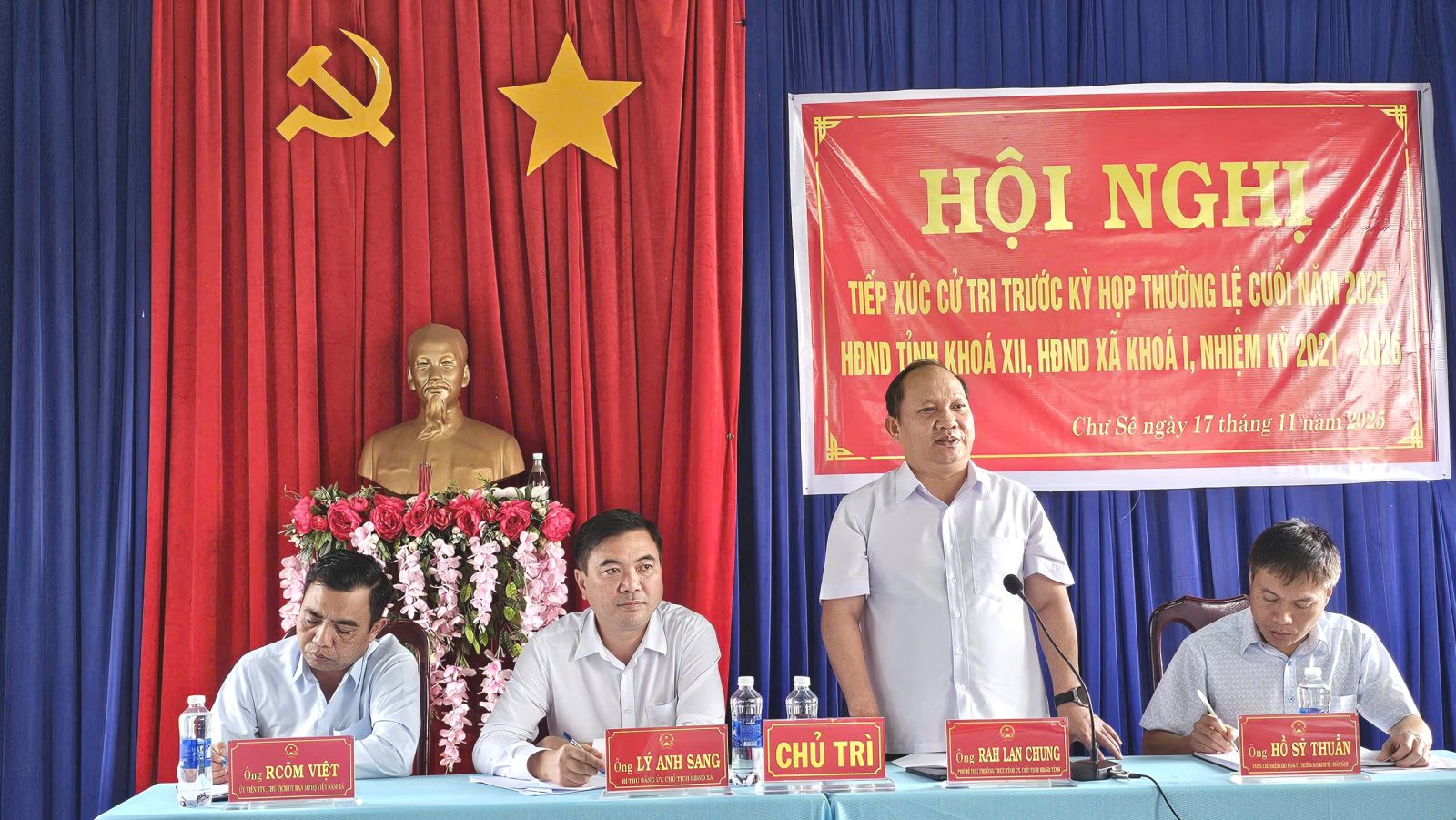 Sáng ngày 17/11/2025, tại nhà văn hóa xã Ia Blang cũ, đại biểu HĐND tỉnh và xã gồm các ông: Rah Lan Chung – Phó bí thư Thường trực Tỉnh ủy Gia Lai – Chủ tịch HĐND tỉnh; Lý Anh Sang – Bí thư Đảng ủy, Chủ tịch HĐND xã Chư Sê; Rcõm Việt - Chủ tịch Ủy ban Mặt trận Tổ quốc Việt Nam xã; Hồ Sỹ Thuần – Chủ nhiệm UBKT Đảng ủy, Trưởng ban Kinh tế - Ngân sách HĐND xã đã có buổi tiếp xúc cử tri với bà con nhân dân trên địa bàn xã Ia Blang cũ ,trước kỳ họp thường lệ cuối năm HĐND tỉnh khóa XII và HĐND xã Chư Sê khóa I, nhiệm kỳ 2021 – 2026. Dự buổi tiếp xúc có đồng chí Nguyễn Văn Đương – Phó chủ tịch UBND xã và lãnh đạo Phòng kinh tế, Phòng văn hóa – xã hội xã.