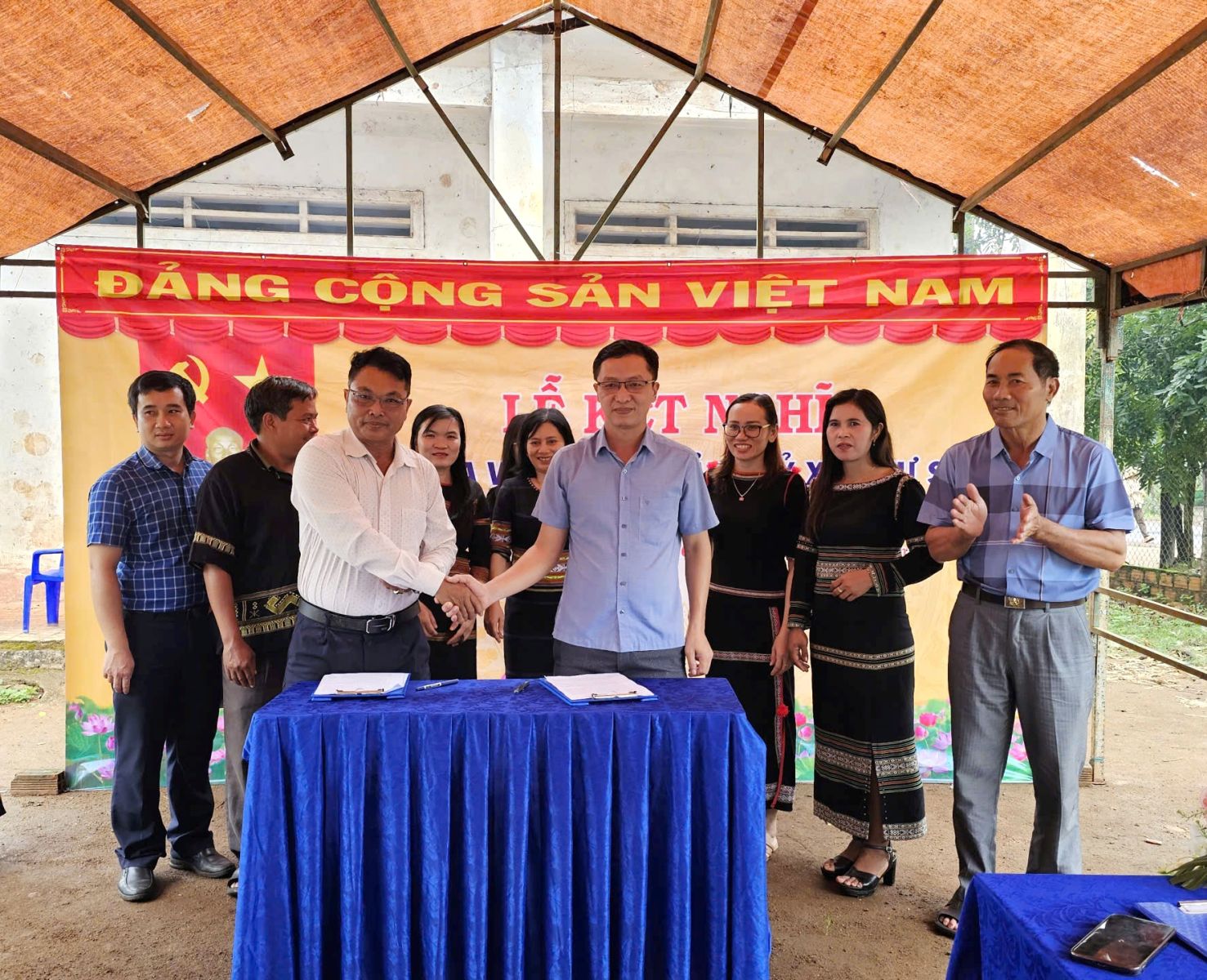 Đại diện Văn phòng Đảng ủy xã và làng Greo Pết ký kết nghĩa. Ảnh: Mỹ Đức