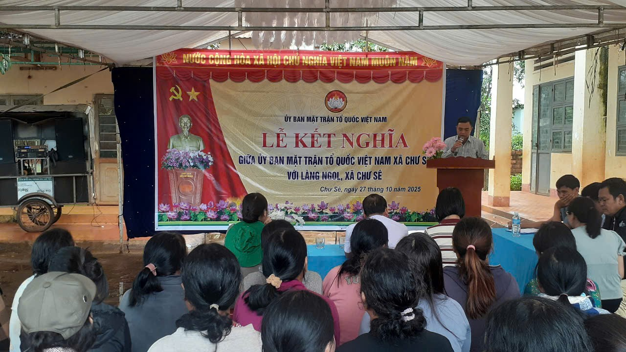 Phát biểu tại buổi lễ ông Rcõm Việt-Chủ tịch Ủy ban MTTQ Việt Nam xã Chư Sê nhấn mạnh việc kết nghĩa nhằm xây dựng mối quan hệ đoàn kết, thống nhất, giúp đỡ nhau giữa Ủy ban MTTQ Việt Nam xã vớihệ thống chính trị và nhân dân làng Ngol, nhằm phát huy sức mạnh khối đại đoàn kết toàn dân tộc, huy động nguồn lực xây dựng làng ngày càng phát triển, góp phần đảm bảo an ninh chính trị, trật tự an toàn xã hội ở địa phương.