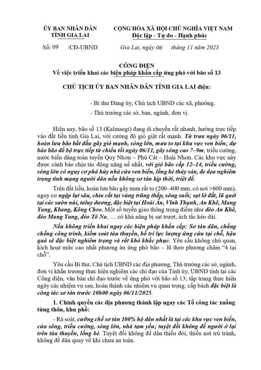 Thứ năm, 06/11/2025 | 10:50 A- A A+ | Công điện khẩn của UBND tỉnh về việc triển khai các biện pháp khẩn cấp ứng phó với bão số 13 Chia sẻ Đọc bài Lưu Công điện khẩn của UBND tỉnh về việc triển khai các biện pháp khẩn cấp ứng phó với bão số 13Chi tiết xem văn bản kèm theo: