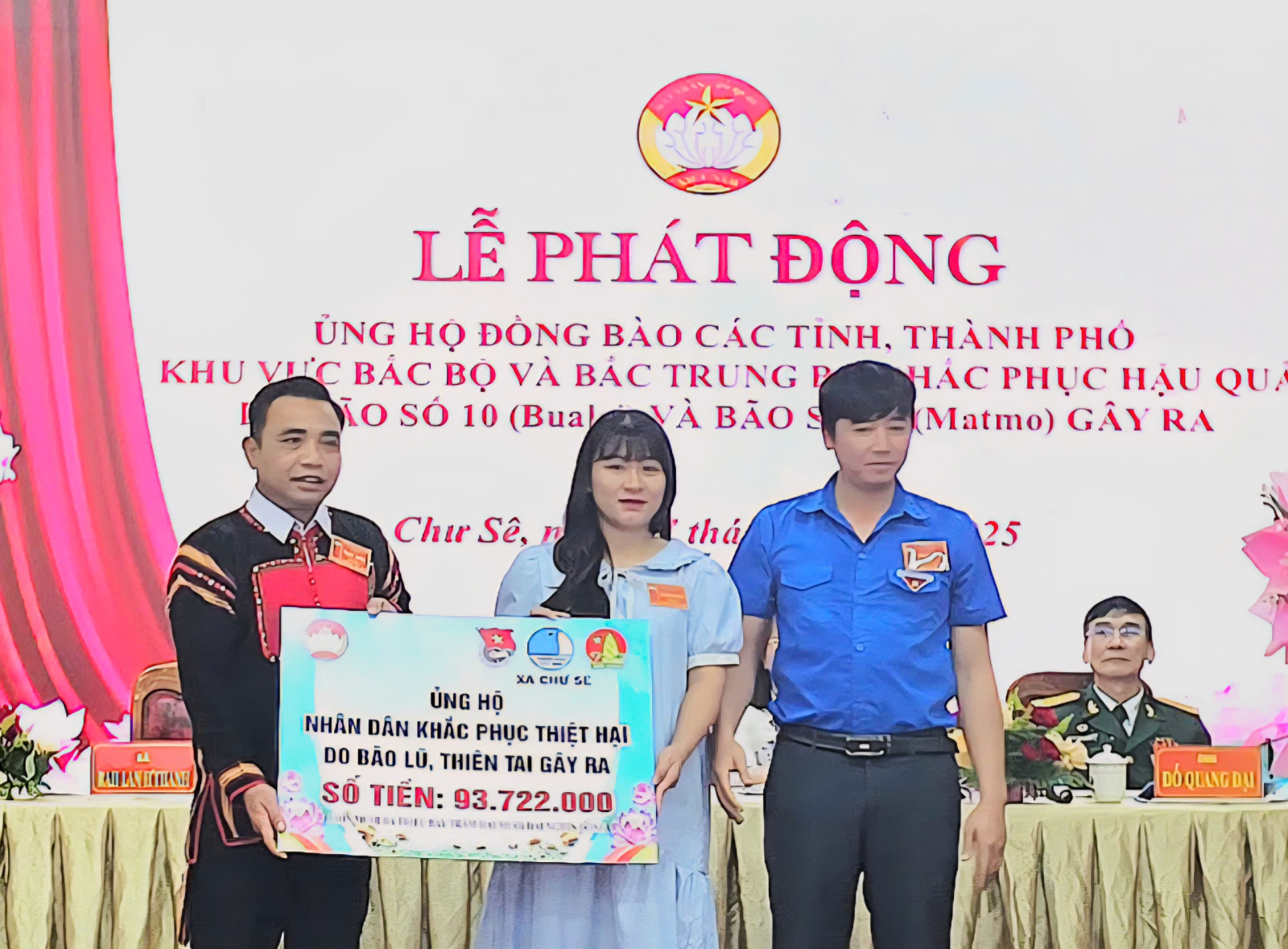 Đoàn thanh niên xã Chư Sê ủng hộ nhân nhân khắc phục thiệt hại do bão gây ra. Ảnh: Trịnh Thắm.