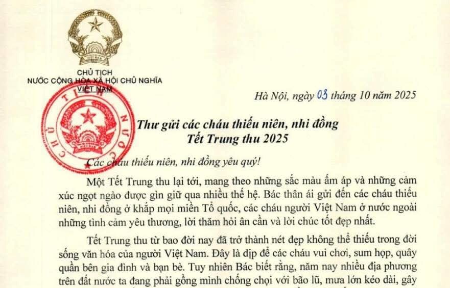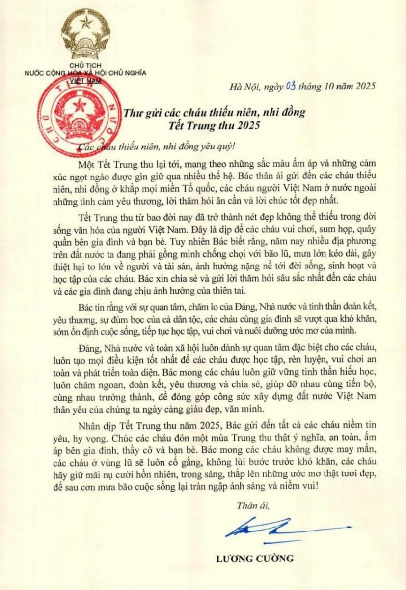 Thứ sáu, 03/10/2025 | 15:24 A- A A+ | Thư chúc Tết Trung thu 2025 của Chủ tịch nước Lương Cường dành cho các cháu thiếu niên, nhi đồng Chia sẻ Đọc bài Lưu