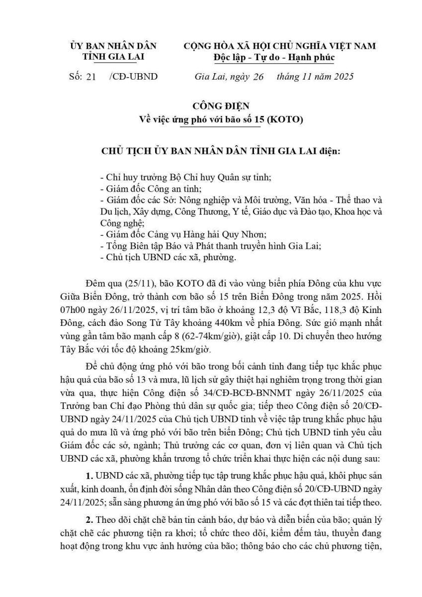 Thứ ba, 25/11/2025 | 10:55 A- A A+ | Công điện số 21 về việc ứng phó với bão số 15 (KOTO) Chia sẻ Đọc bài Lưu Công điện số 21 về việc ứng phó với bão số 15 (KOTO)