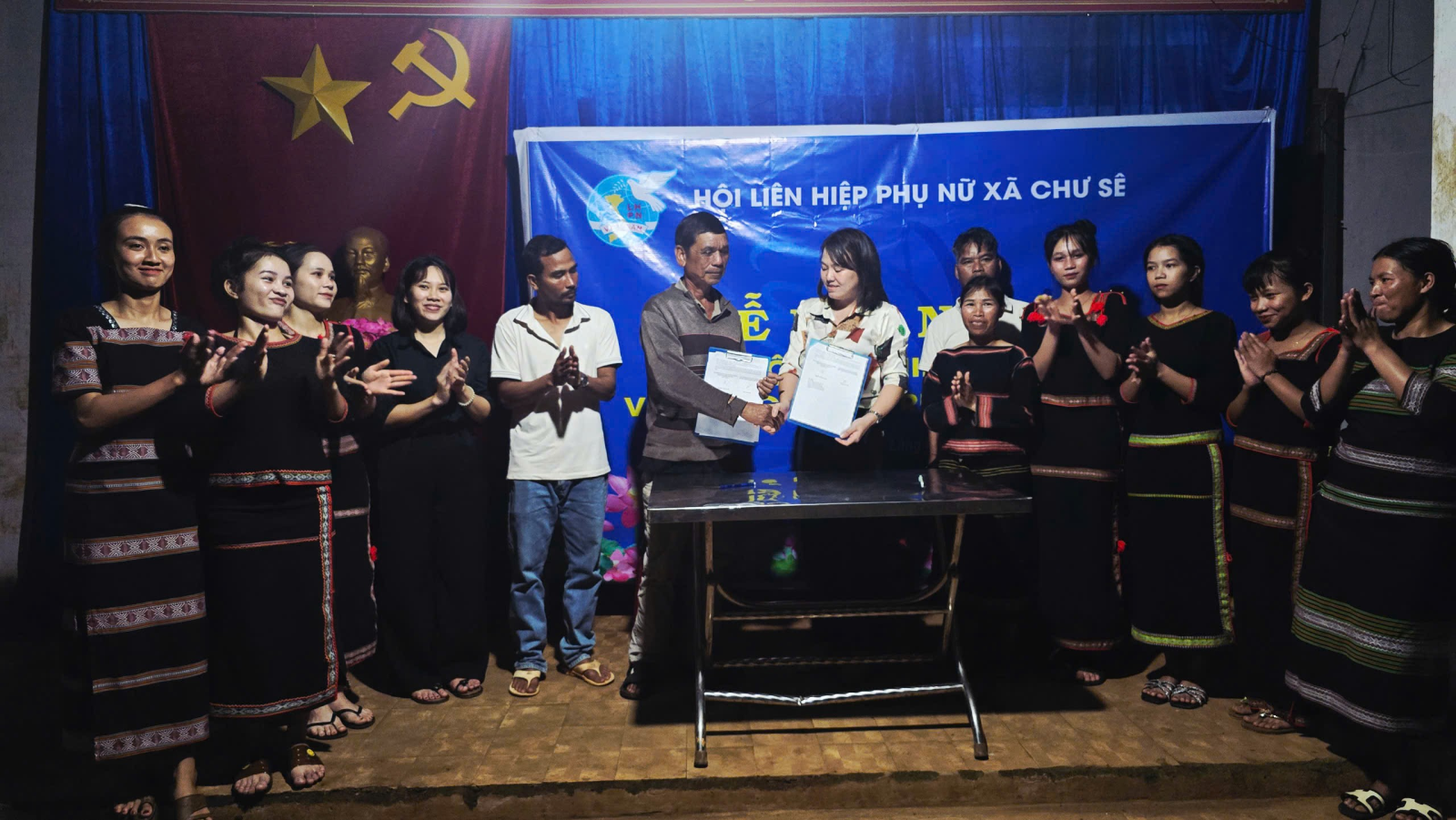 Hội Liên hiệp Phụ nữ xã Chư Sê và thôn Hăng Ring tiến hành kí kết bản Bản Giao ước. Ảnh: TT.
