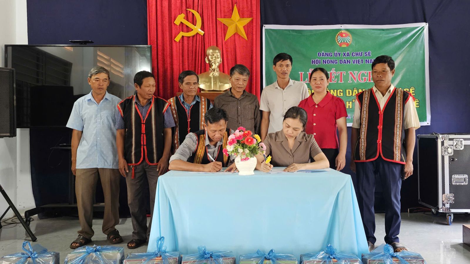 Lãnh đạo hội nông dân ký giao ước kết nghĩa với đại diện làng Mung H’lú. Ảnh: Mỹ Đức