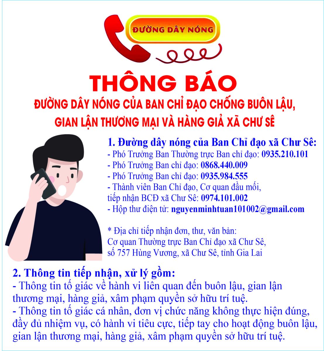 Ban Chỉ đạo xã Chư Sê Thông báo đường dây nóng tiếp nhận thông tin tố giác