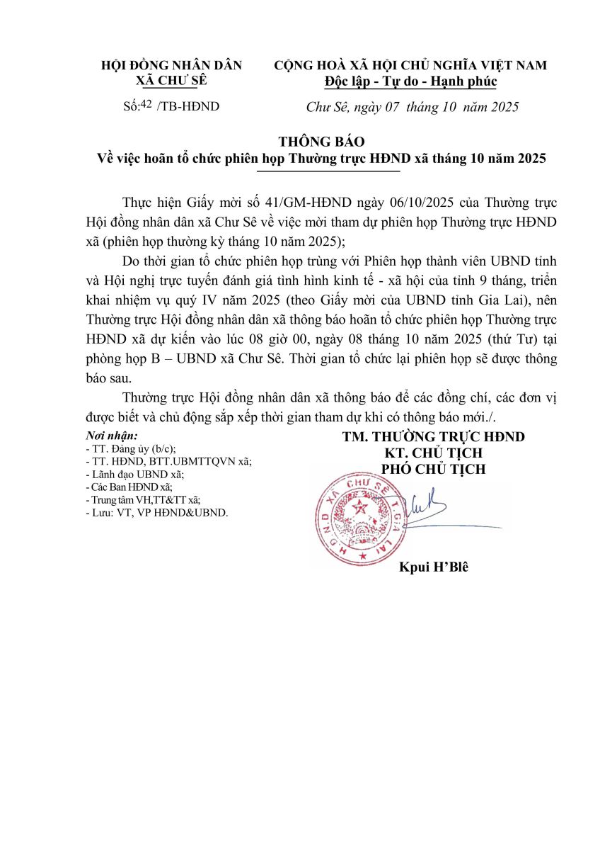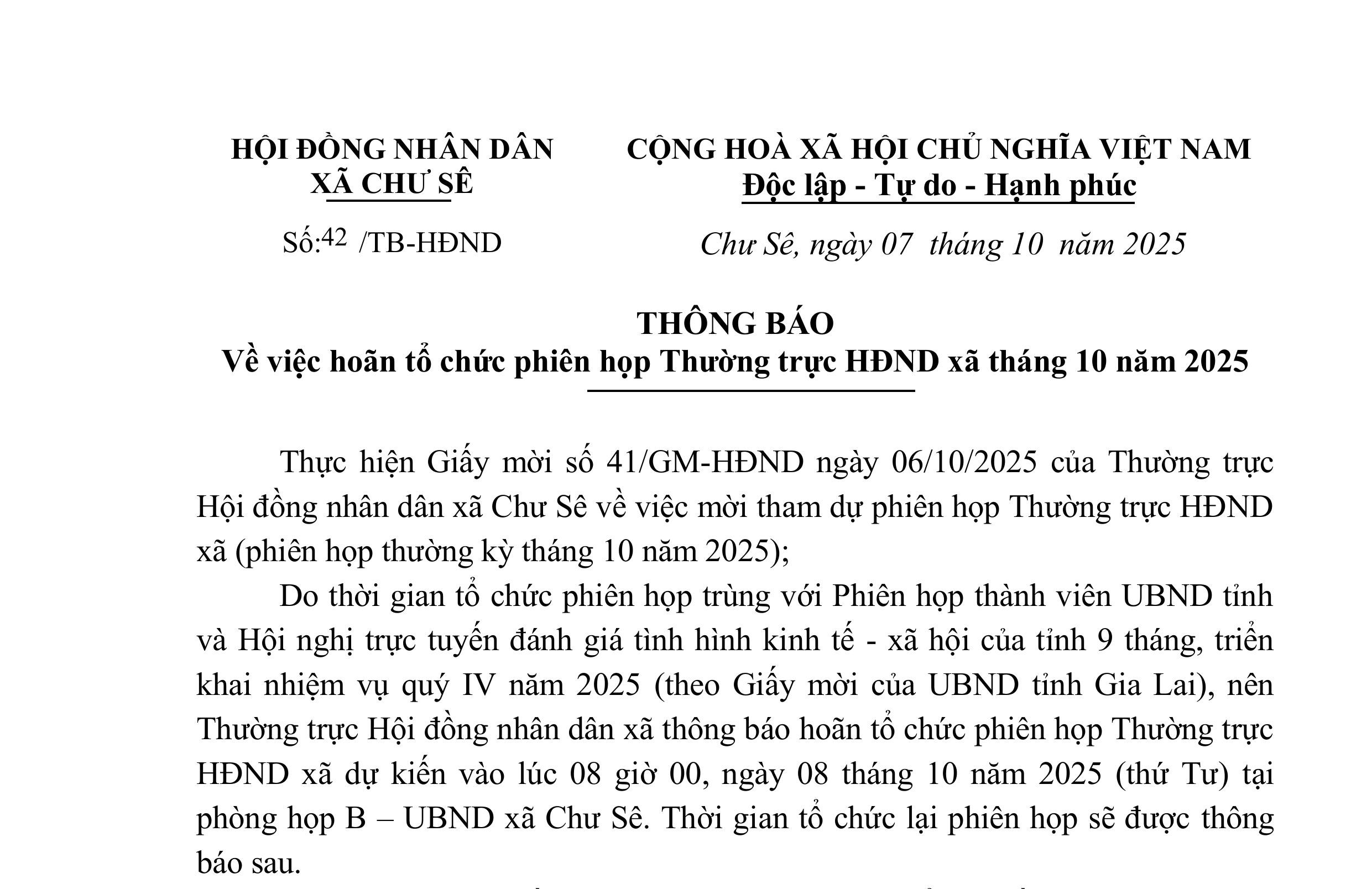 Thứ ba, 07/10/2025 | 16:14 A- A A+ | Thông báo hoãn tổ chức phiên họp Thường trực HĐND xã tháng 10 năm 2025 Chia sẻ Đọc bài Lưu Tập tin đính kèm Trình duyệt không hỗ trợ iframe.